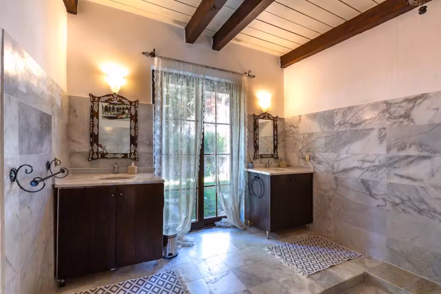 Three luxurious en-suite bathrooms plus a guest toilet ensure comfort and privacy for all guests. Finished in warm beige marble with modern fixtures, walk-in showers, and elegant lighting, each bathroom maintains the villa's signature blend of traditional Turkish style and contemporary luxury.