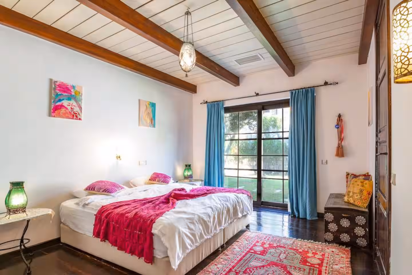 This spacious master suite features soaring wooden beam ceilings, elegant blue curtains, and vibrant Turkish artwork. The room opens directly onto the lush gardens through French doors, creating a seamless indoor-outdoor flow.
