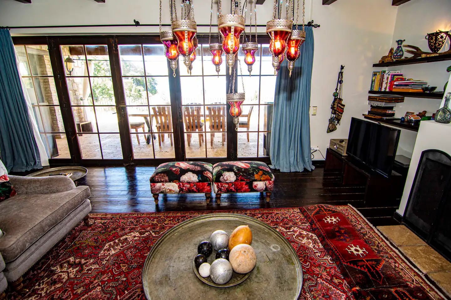 The stunning living room features plush teal velvet sofas, exposed wooden beams, and a magnificent Turkish chandelier that serves as the room's crown jewel. Traditional oriental rugs ground the space while adding rich texture and pattern.